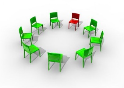 Eine Gruppe von eher weniger froh gestimmten Menschen sitzt auf Stühlen, die in einem Kreis angeordnet sind. Die TeilnehmerInnen des Stuhlkreises erzählen sich gegenseitig ihre Sorgen und Nöte und nicken sich verständnisvoll zu…